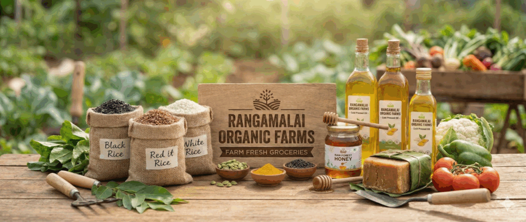 Shop authentic organic groceries direct from our farm. Discover native rice, cold-pressed oils, raw honey, cane jaggery & spices. Pure, natural & sustainable.