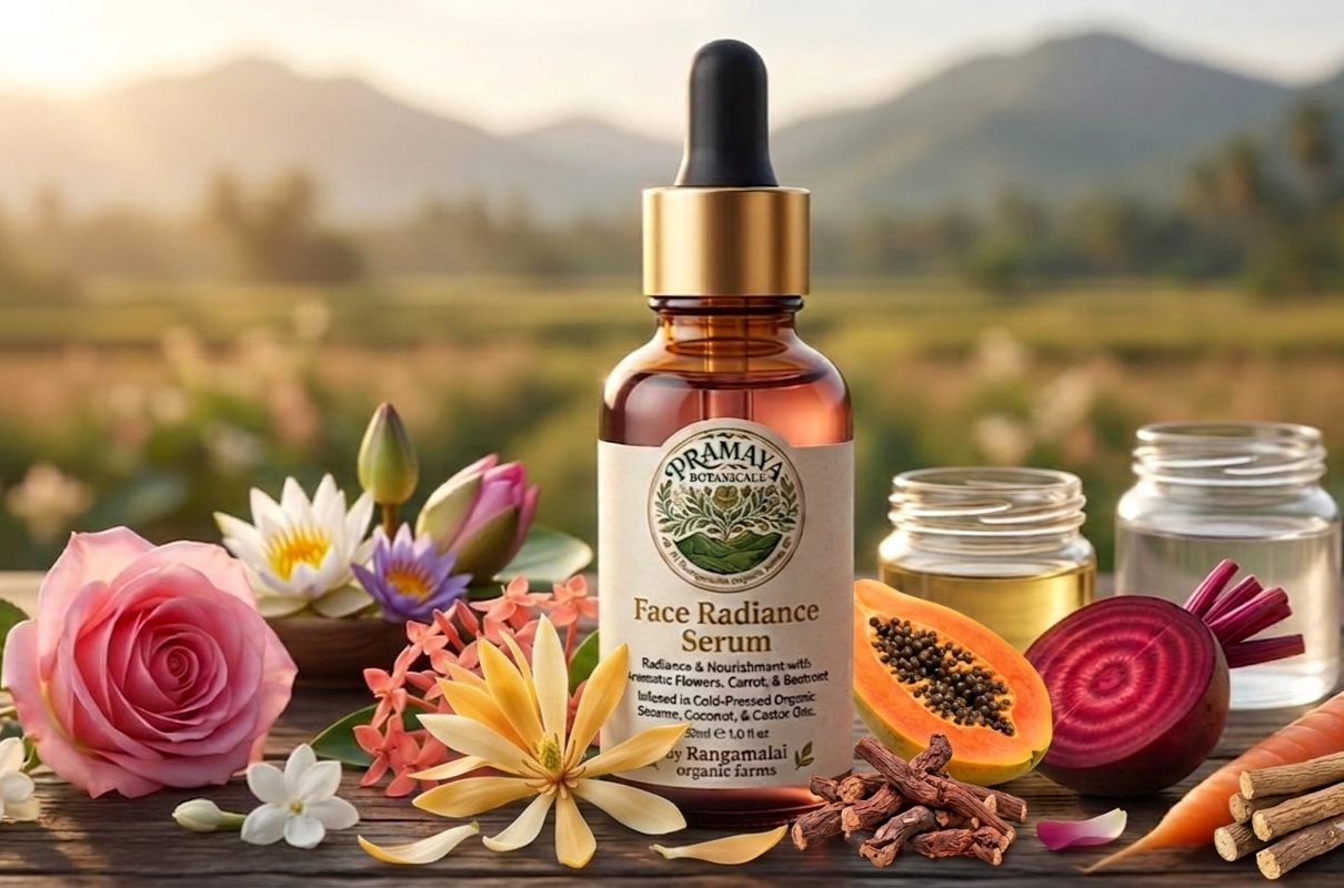 At Pramaya Botanicals, we marry twenty-three years of technical precision with eleven years of regenerative farming wisdom. The Floral Face Radiance Oil Serum is the jewel of our collection — handcrafted, never mass-produced.