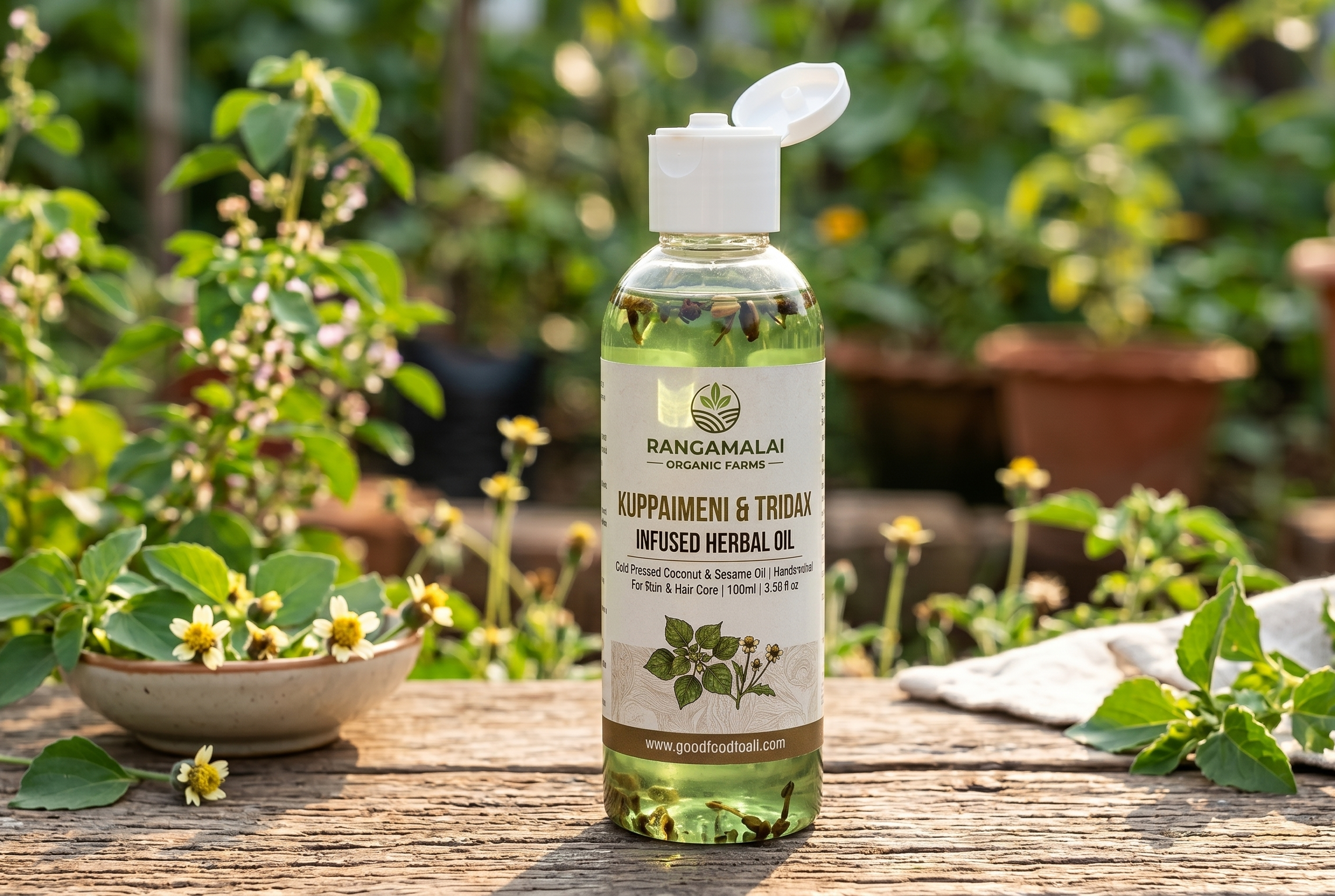 Every bottle of Kuppaimeni Thailam is grown, pressed and brewed on Rangamalai Organic Farms in Karur, Tamil Nadu — a permaculture and natural-farming homestead recognised by the UN One Planet Network and home to a seed bank of 230+ traditional varieties.