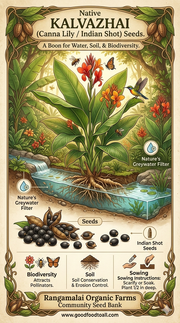 Bring vibrant color and powerful ecological benefits to your land with our native Kalvazhai (Canna Lily) seeds. Often referred to as Manivazhai or “Indian Shot” due to its perfectly round, hard black seeds, this perennial herb is much more than just an ornamental beauty. It is an essential companion plant for permaculture setups, food forests, and sustainable home gardens.