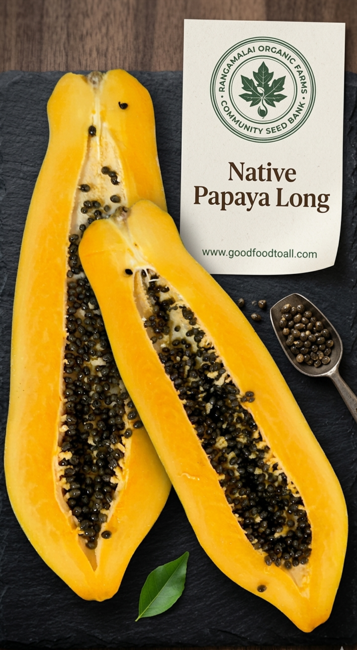 This is one of the longest native papaya varieties in our seed collection, prized for its bright yellow flesh and naturally sweet flavor. Discovered on the foothills of the Sirumalai Hills in Dindigul, Tamil Nadu, this unique variety stands out for both its taste and size.