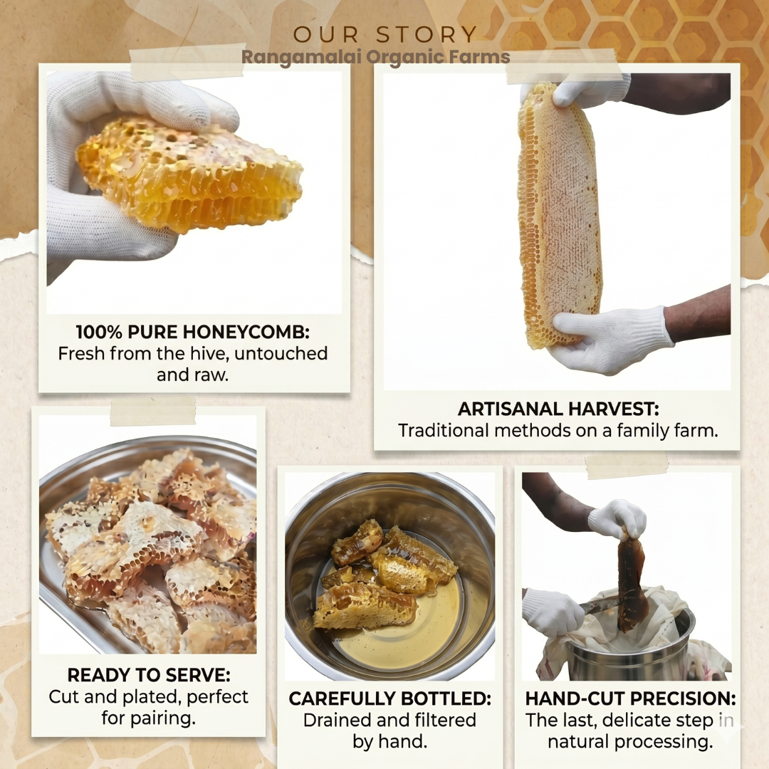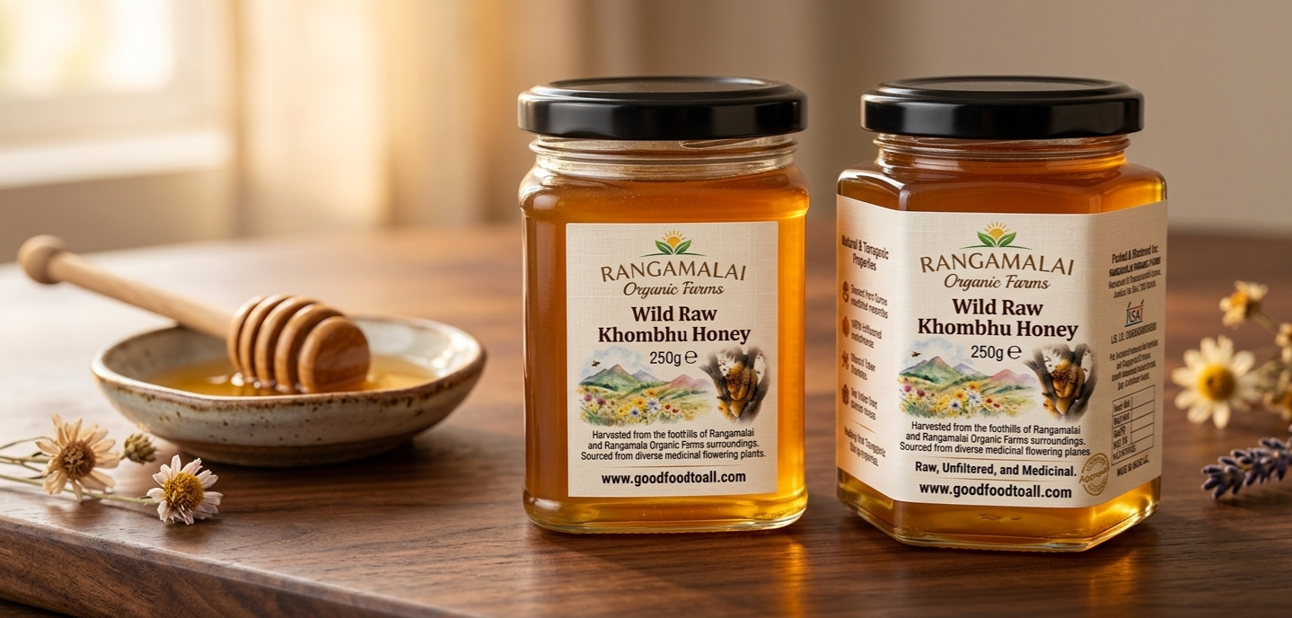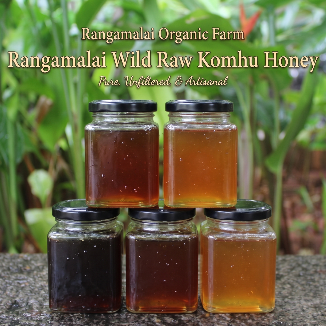 Rangamalai Khombu Honey is wild-harvested from a specific, named location; raw and unheated; pollen-rich; produced by a smaller, wild bee species foraging on medicinal plants; and genuinely scarce. It’s comparable to wild-caught fish versus farmed fish — same category, entirely different product.